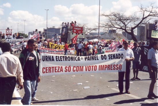 Luiz Ezildo Silva (segurando a faixa, à esquerda, encoberto por outro manifestante)