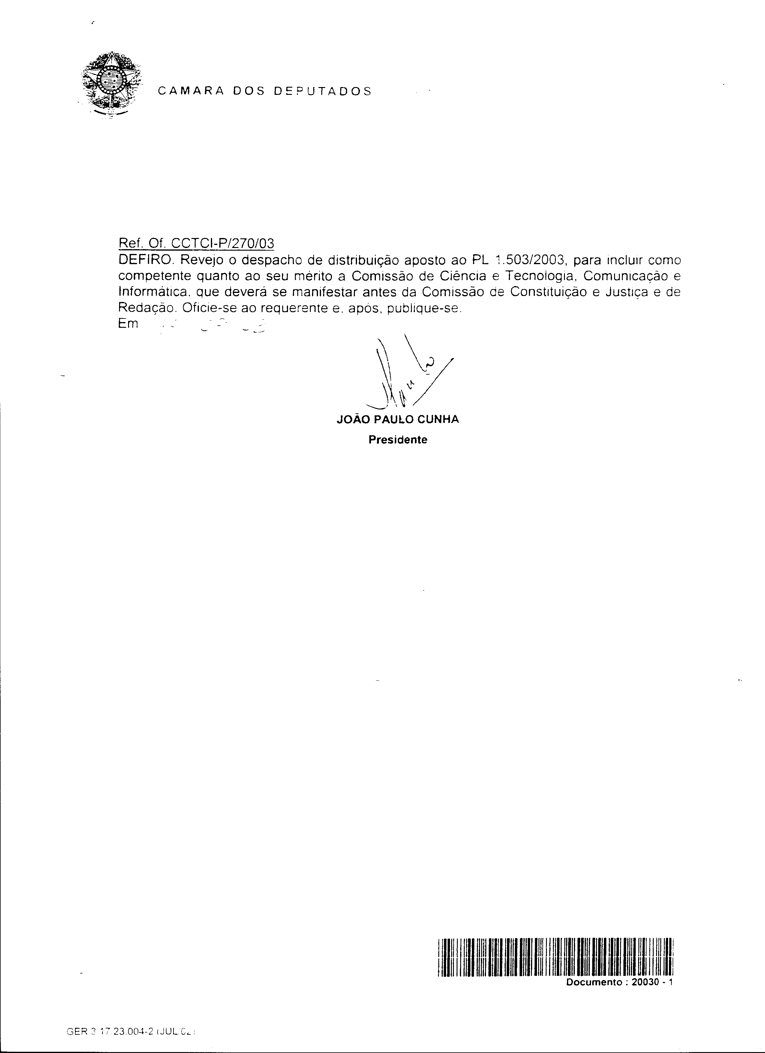 Documento 2 - Ofício do Presidente da Câmara, de 17/09/2003, deferindo o pedido CCTIC-P270/03